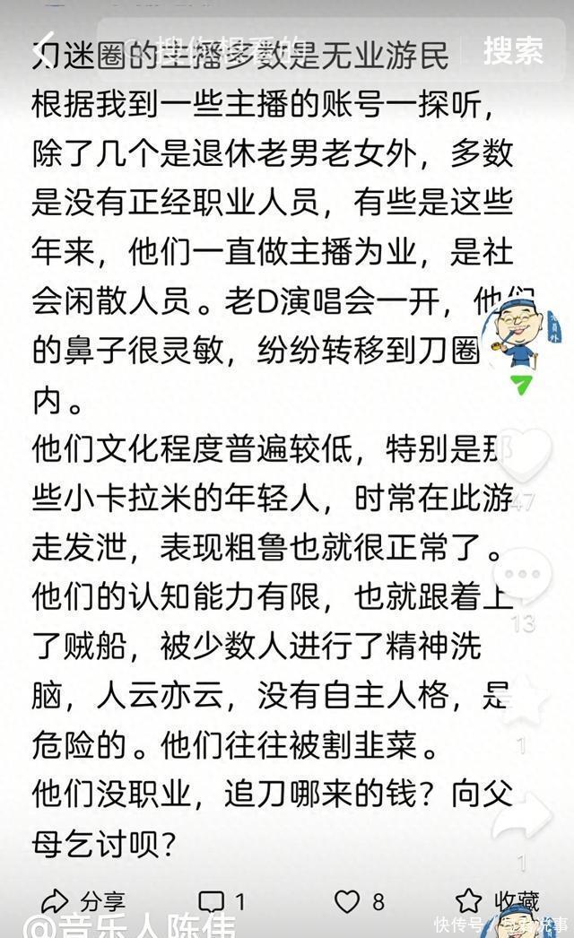 刀迷圈的主播多数是无业游民。 根据我到一些主播的账号探听,除了几个是退休老男老女外,多数是没有正经职业人员。 有些是这些年来,他们一直做主播为业,是社会闲散人员。 老刀演唱会一开,他们的鼻子很灵敏,纷纷转移到刀圈内。 他们文化程度普遍较低,特别是那些小卡拉米的年轻人,时常在此游走发泄,表现粗鲁也就很正常了。 他们的认知能力有限,也就跟着上了贼船,被少数人进行了精神洗脑,人云亦云,没有自主人格,是危险的。 他们往往被割韭菜。 他们没职业,追刀哪来的钱?向父母乞讨呗?